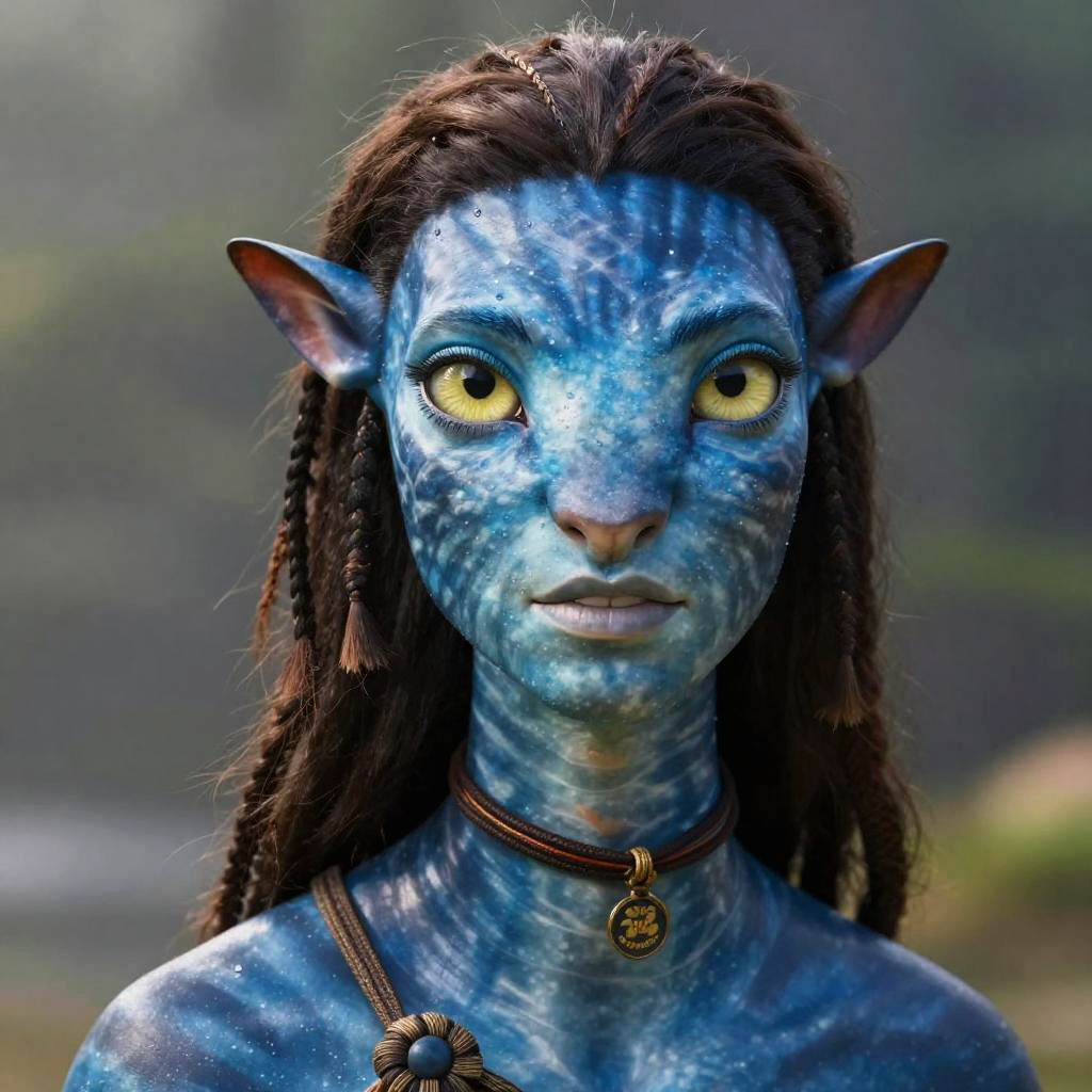 Was Dwayne Johnson in Avatar, portrait of Dwayne Johnson as a Na'vi character with blue skin and yellow eyes, detailed close-up, hyperrealistic style
