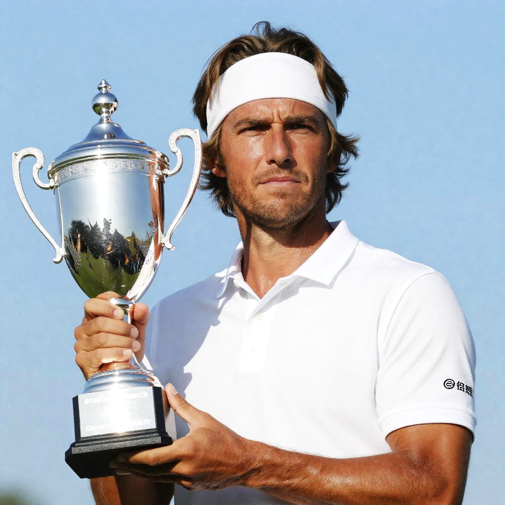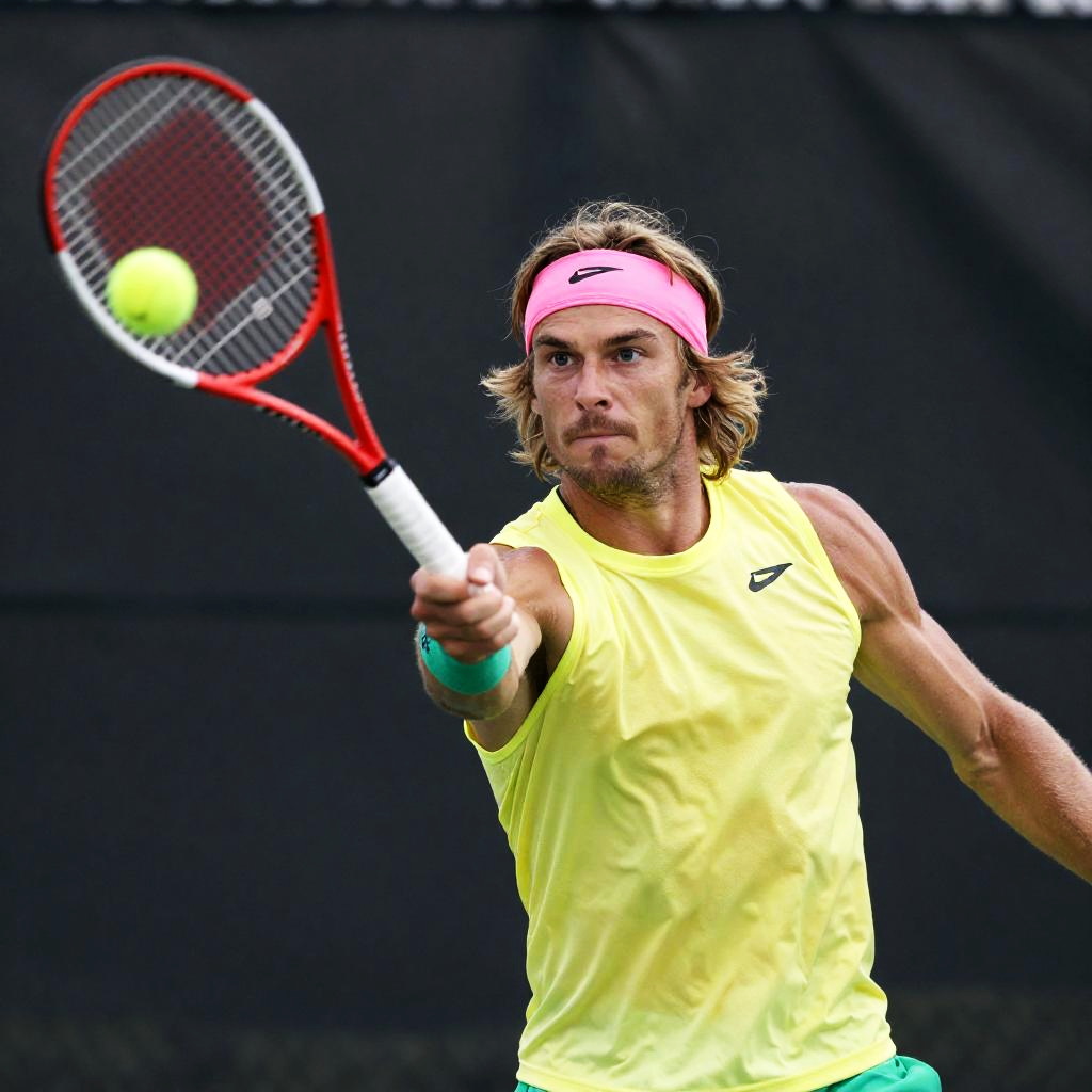 Athletic man with long blonde hair wearing a red headband, blue sunglasses, and bright orange shirt is captured mid-serve holding a black and white tennis racket. Outdoor daytime setting with a green background and a tennis ball in the air. The player shows a focused expression with hair blown by the wind.