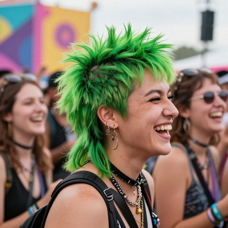 A diverse group of friends laughing at a music festival, one person prominently featuring an oversized, stylish mullet hairstyle with bright green hair, joyful atmosphere, colorful backdrop, natural lighting, MidJourney style.