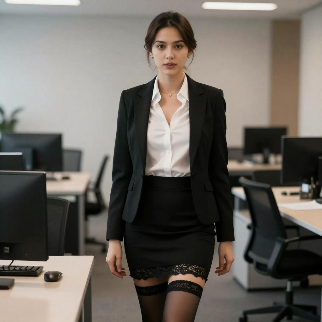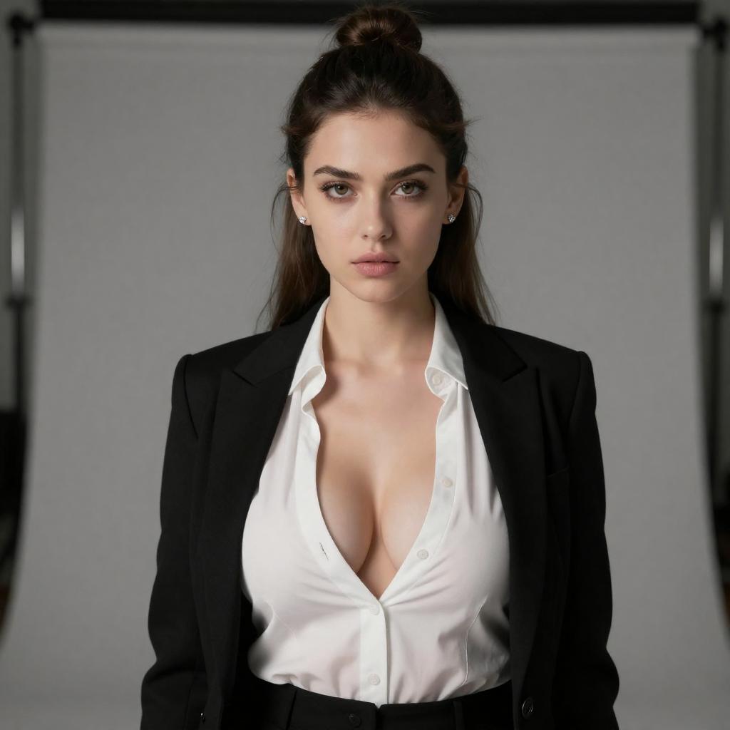 1girl, solo, long hair, back screen is big which is from the floor to ceiling and left to right, beautiful face, nikon RAW photo, 8 k, Fujifilm XT3, masterpiece, best quality, realistic, photorealistic, ultra detailed, knee shot, medium shot, horizontal view, diamond stud earrings, long hair in bun, hazel eyes, serious expression, slender figure, wearing a black blazer and white blouse, sexy, erotic, seductive, huge breast, (nsfw:1.2), facing viewer, firm breast cleavage