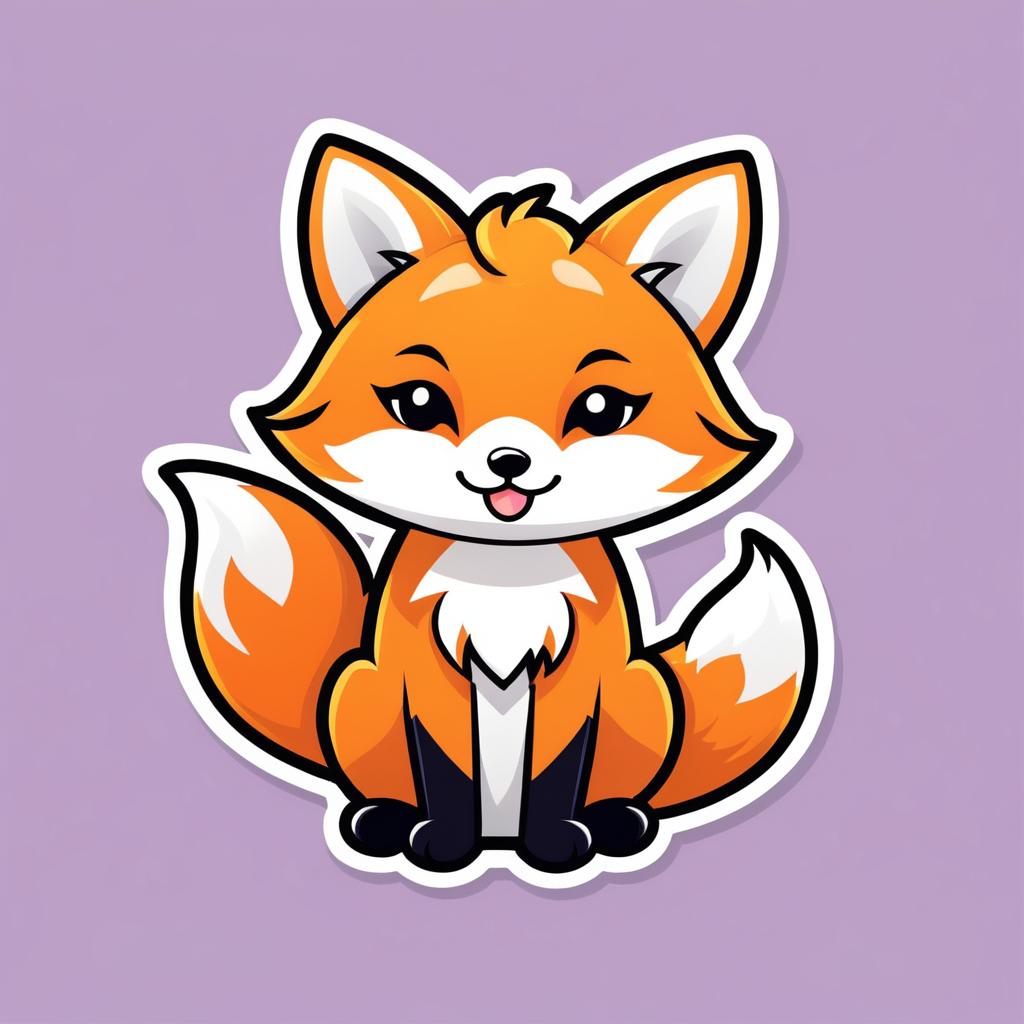 Illustration of a cute cartoon fox with a fluffy tail, orange and white fur, black eyes, and a friendly expression. The fox is sitting and outlined with a white and black border on a light beige background.
