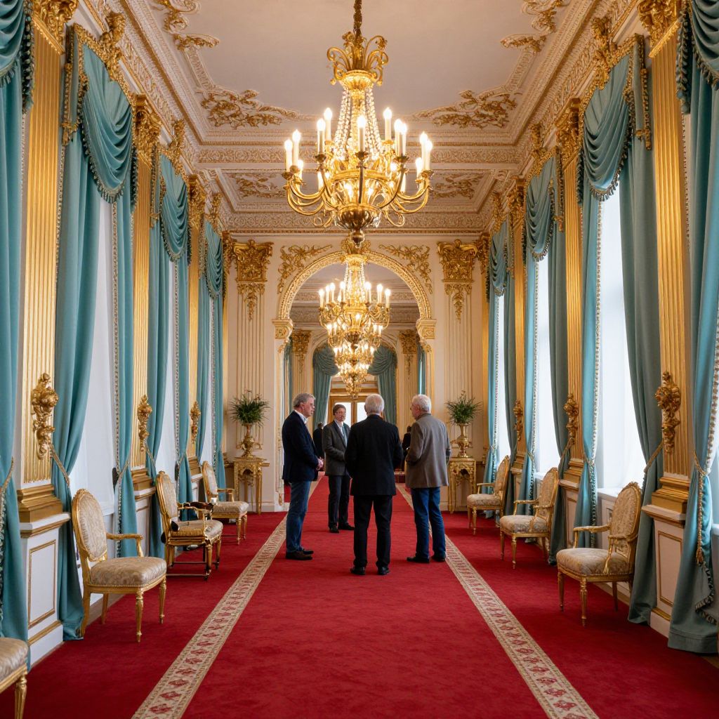 Elegantly ornate Tsarist palace corridor featuring a grand chandelier suspended above a vibrant red carpet, flanked by gold accents, teal drapes, and opulent furnishings, with several individuals engaged in conversation along its length.