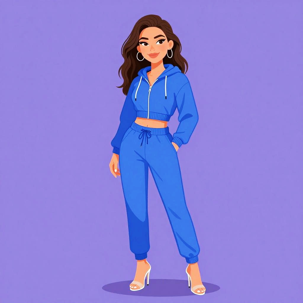 Digital illustration of a confident woman with long brown hair, wearing a blue hoodie and matching joggers, white high heels, large hoop earrings, and a