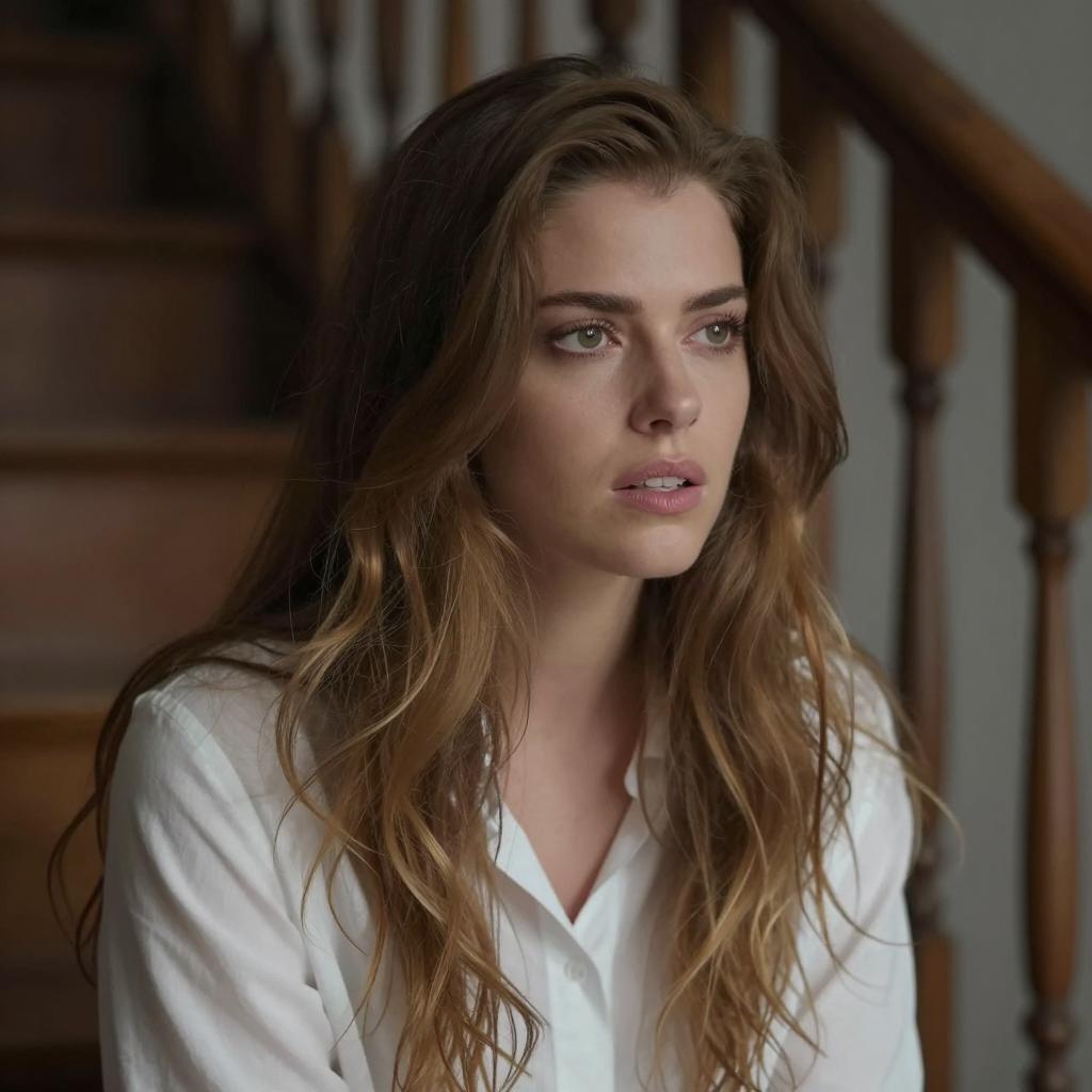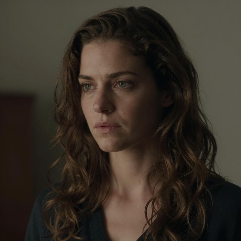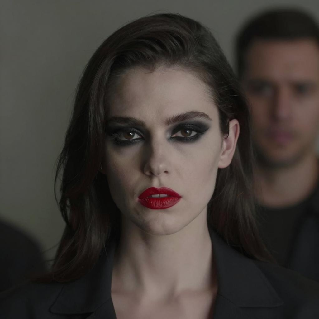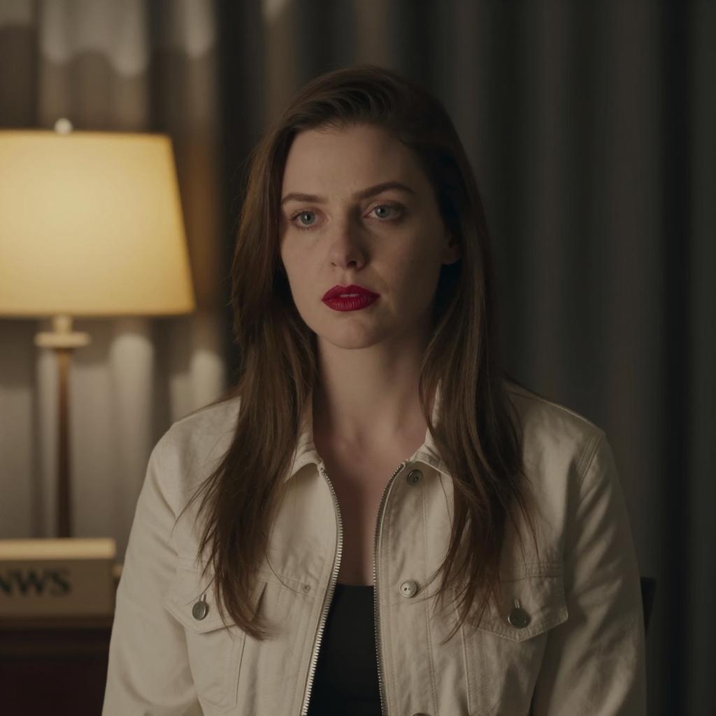 A woman with long brown hair, pale skin, and red lipstick. She wears a beige jacket and looks slightly to the side with a neutral expression. In the background, there is a dark curtain, a lamp with a yellow shade, and a box labeled "NWS". The lamp is illuminated. The woman is centered in the frame, and the background elements are slightly out of focus.