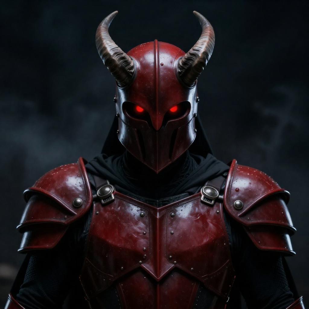 Photograph of a dark, menacing figure with glowing red eyes and a horned helmet. The figure's red, glossy armor reflects light, creating a dramatic contrast against a dark, smoky background. The helmet's sharp horns and intense gaze add to the ominous presence. The figure's face is partially obscured, enhancing the mysterious and fearsome atmosphere.