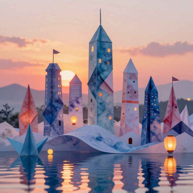Kreative image illustrating an imaginative cityscape at sunset, with buildings formed from folded origami paper and flowing watercolor textures, accented by glowing lanterns and dynamic reflections in the water
