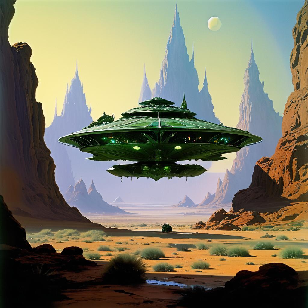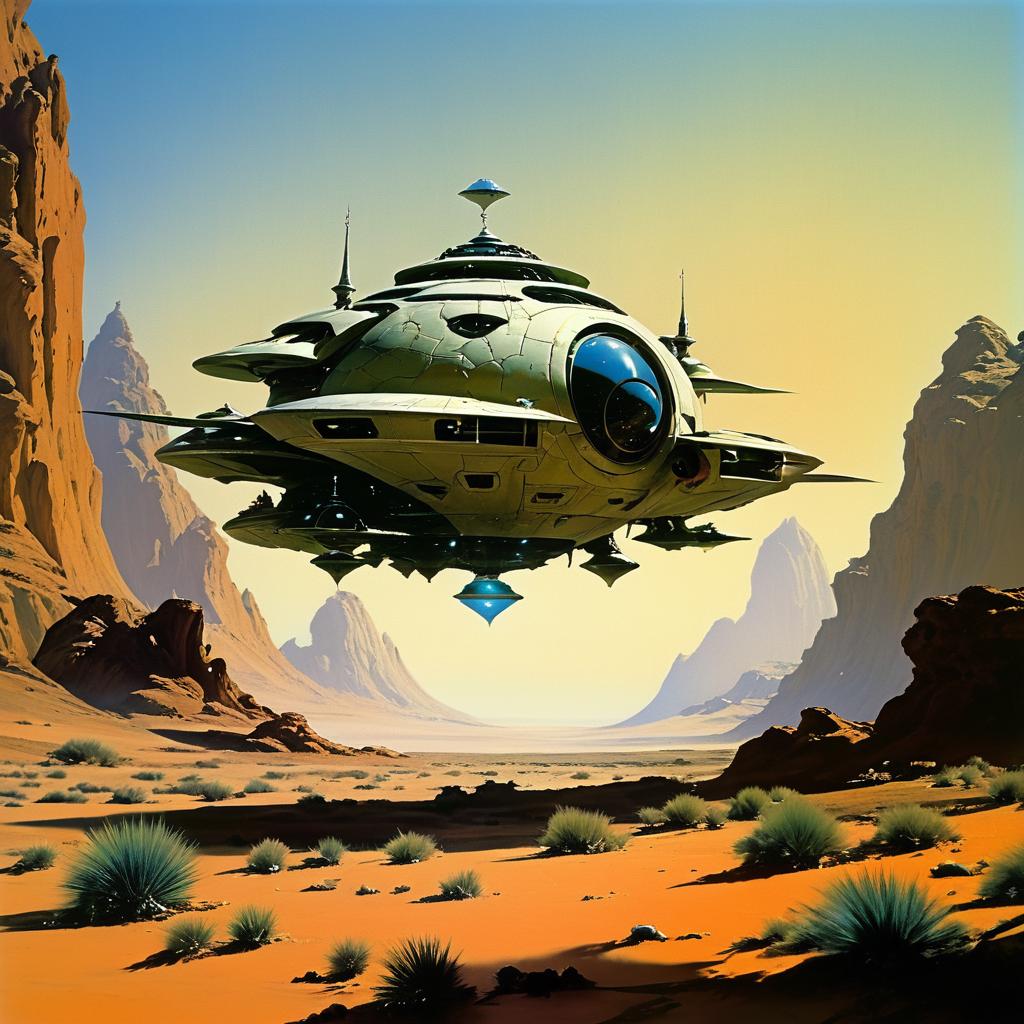 A small, organic-shaped dropship lander hovers above a vast alien desert landscape framed by towering rocky cliffs. The scene features multiple large moons in the sky, adding a cinematic, otherworldly atmosphere. A vintage, sci-fi styled car is parked on the desert floor, contributing to the futuristic narrative. The art style is reminiscent of Frank Frazetta with a matte painting technique.