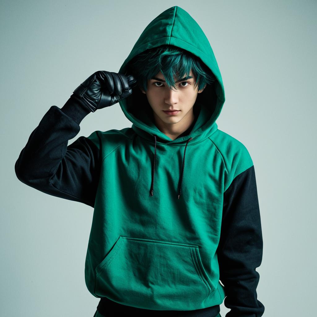 Izuku midoriya outfit,1boy, male focus, solo, green hair, hood, hoodie, gloves, looking at viewer, pants, black gloves, green shirt, closed mouth