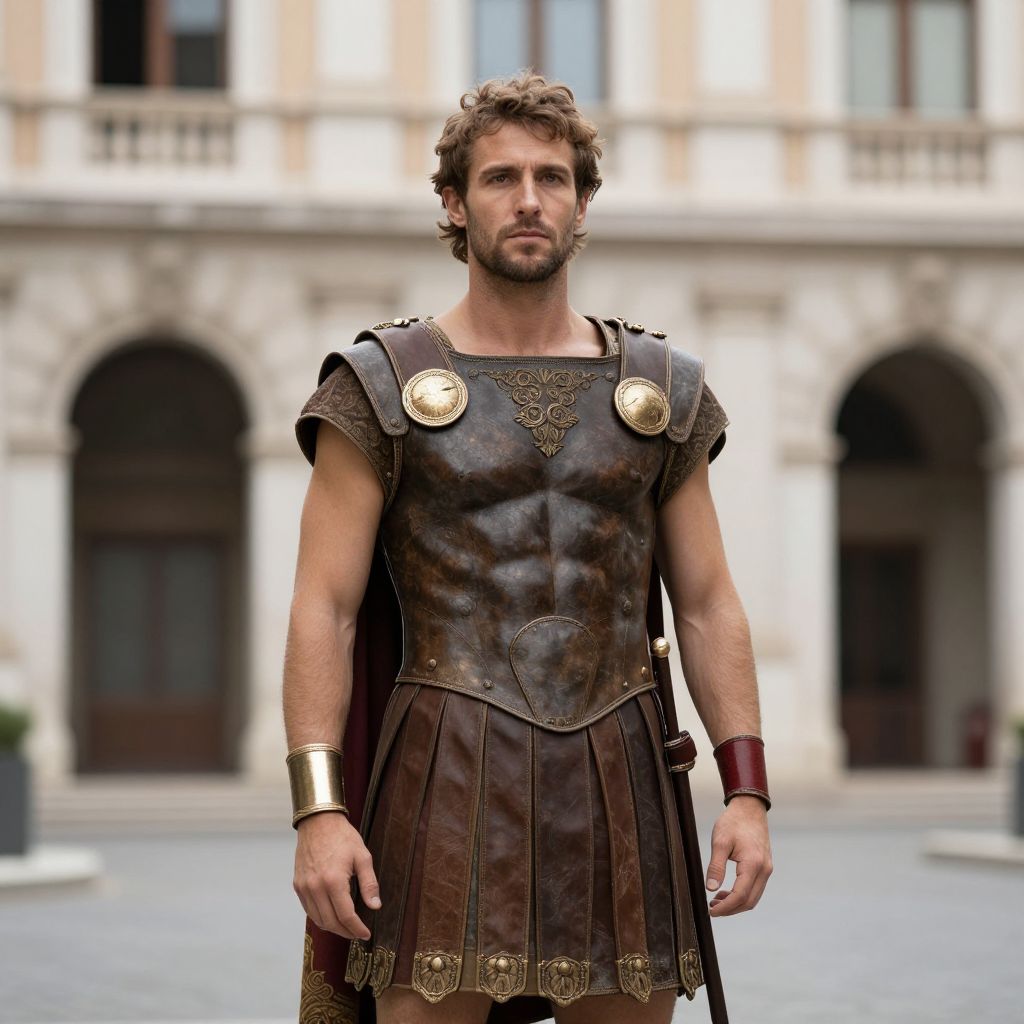Photograph of a muscular, bearded man with curly brown hair, standing in front of a blurred, classical stone building with arched windows. He wears a dark brown, leather Roman-style gladiator outfit with gold shoulder plates, arm bands, and decorative trim. The outfit is slightly weathered, showing some wear and tear. His expression is serious and focused. The background features a light-colored stone facade with architectural details, and the ground is paved with gray cobblestones. The overall image has a slightly digital, CGI-enhanced appearance.