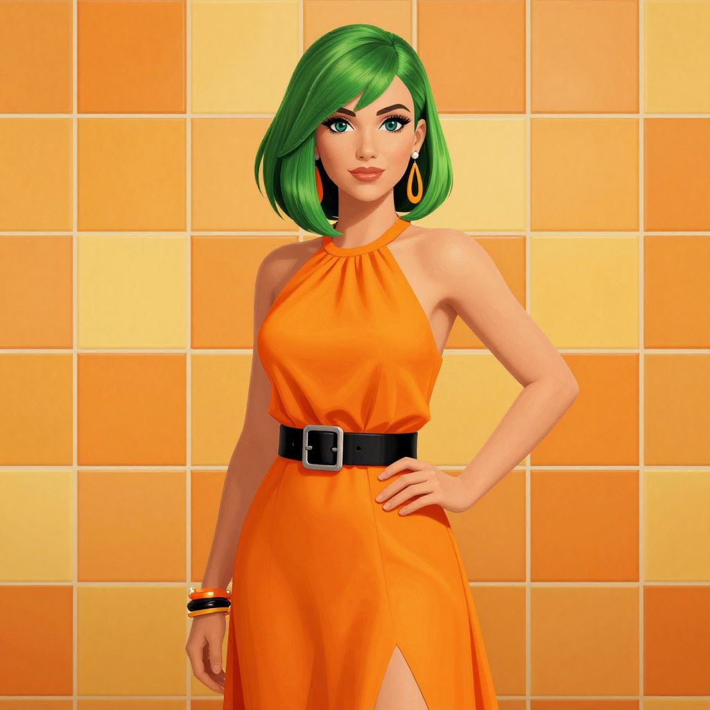 A confident woman with green hair stands against a geometric orange and yellow tiled background. She is wearing an elegant orange halter dress cinched at the waist with a black belt, complemented by bold earrings and bracelets, in a vibrant, stylized digital art style.