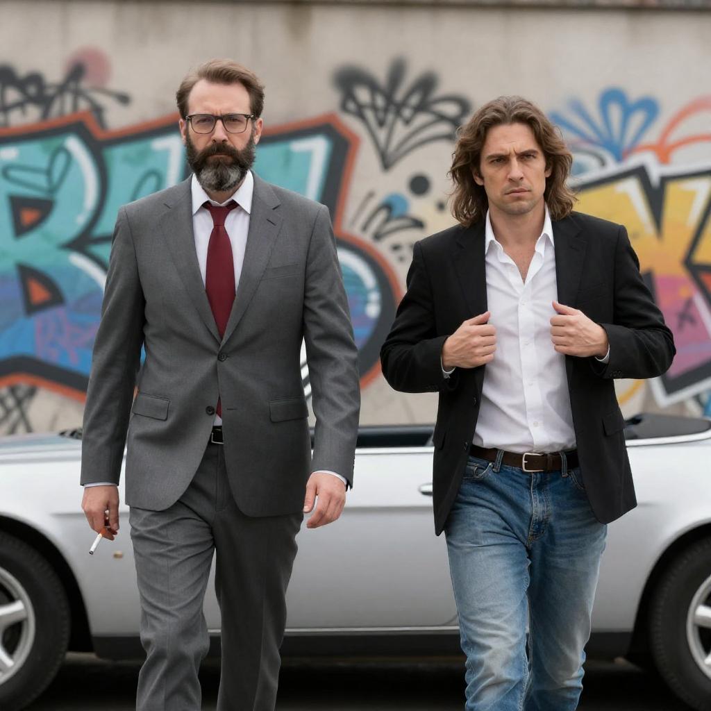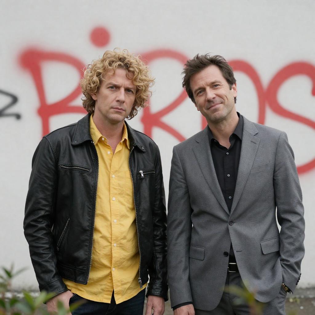 Photograph of two men standing in front of a white wall with red spray-painted . The man on the left has curly blond hair, wears a black leather jacket over a yellow shirt, looks serious. The man on the right has dark hair, wears a gray suit with a black shirt, looks slightly amused. Bushes in foreground.