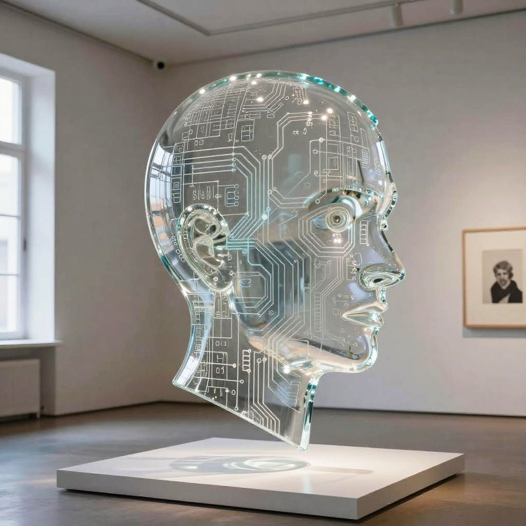 AI sculpture made of translucent glass and circuit patterns, floating in a minimalist gallery space with soft natural lighting, reflecting complex algorithms and human creativity intertwined, photorealistic with clean modern aesthetics