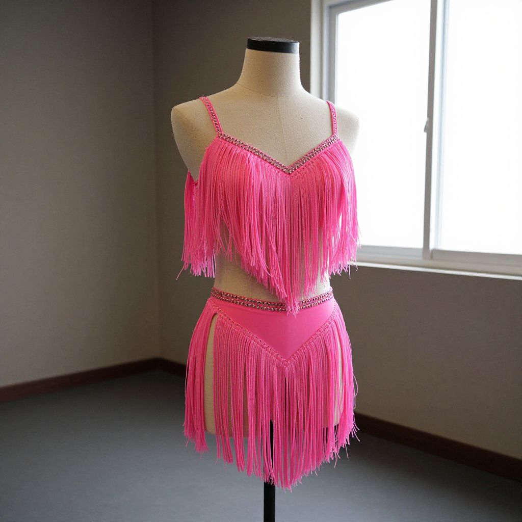 Pink Fringe Dance Costume, dressed in pink standing in a room with a window