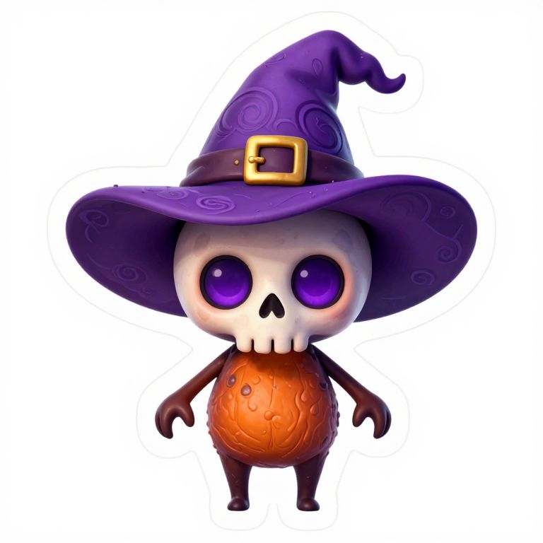 The image features a vibrant and intricately detailed cartoon sticker character, isolated on a white background. The character is a cute and spooky figure, with a mix of adorable and eerie elements. It has large, expressive purple eyes and a small, delicate skull-like face, giving it a charming yet spooky appearance. The character is adorned with a large, ornate purple witch hat, decorated with intricate patterns and a gold buckle, adding to its whimsical and magical aura. The hat has a tall, pointed tip and a curly brim, enhancing its fantastical look. The character's body is small and round, with a textured, orange-brown skin that has a slightly rough and bumpy surface. It has two small, claw-like hands and a pair of legs with thin, delicate legs and feet. The character's arms and legs are positioned in a relaxed, almost playful manner. The background is minimal, allowing the character to stand out prominently. The overall composition is balanced, with the character centrally positioned and the hat and body forming a cohesive unit. The use of vibrant colors, such as the purple eyes, hat, and background, contrasts with the more muted tones of the character's skin, creating a visually striking and captivating image. The intricate details, such as the patterns on the hat and the texture of the skin, add depth and realism to the character, making it appear both cute and spooky. The volumetric lighting enhances the three-dimensional effect, giving the character a lifelike quality. The image is a stunning representation of a whimsical and charming cartoon sticker character, with a high level of detail and a harmonious blend of colors and textures.