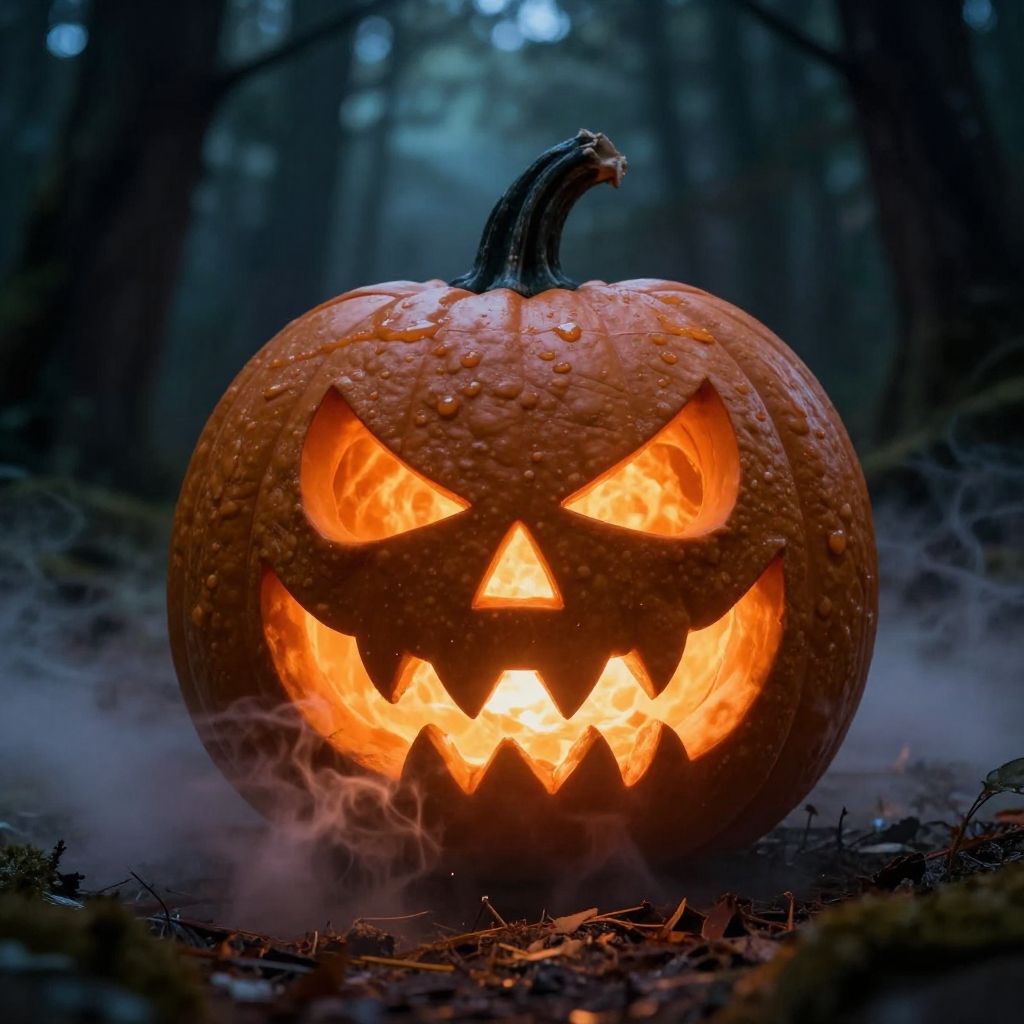 Monster face pumpkin glowing ominously in a dark forest, detailed sharp teeth and fiery eyes, mist swirling around, eerie Halloween night atmosphere, high resolution