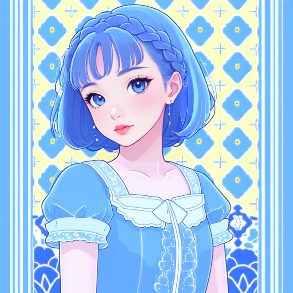Illustration of an anime-style young woman with short blue hair featuring a side braid, bright blue eyes, and soft makeup. She wears a detailed blue dress with puff sleeves, a ribbon bow, and lace trim. The background includes a decorative blue and yellow floral pattern, enhancing the pastel thematic color palette.