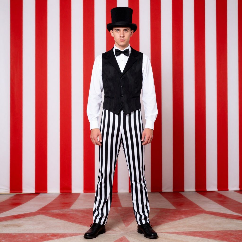 Photograph of a young man standing in front of a red and white striped background. He is wearing a black top hat, white dress shirt, black pinstriped vest, and black and white vertically striped trousers. His black shoes are polished. The floor has a red and white checkered pattern. The man's expression is neutral, and he stands with his hands by his sides. The overall style is reminiscent of classic circus or vaudeville attire. The image is brightly lit, emphasizing the bold color contrast and stripes.