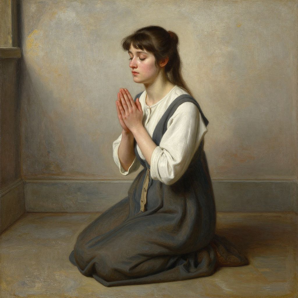 This is a digital painting of a young woman with fair skin and dark brown hair, kneeling on a wooden floor in a plain, dimly lit room. She is dressed in a white long-sleeved blouse and a dark blue pinafore dress. Her hands are clasped together in a prayer position, with her eyes closed and a serene expression on her face. The background features muted, textured walls and a wooden baseboard. The lighting emphasizes her delicate features and the soft texture of her clothing, creating a peaceful, contemplative atmosphere. The style of the painting is realistic with subtle, warm color tones.