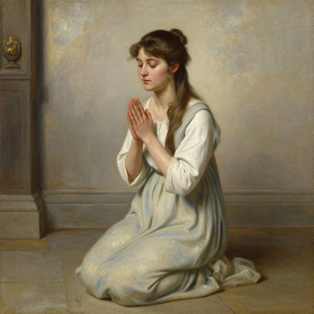 Digital painting of a young woman with fair skin and brown hair, kneeling in prayer with hands raised, wearing a white blouse and dark blue dress, in