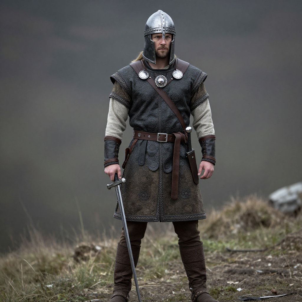 "Viking Warrior Dress, man in a viking costume with a sword and a helmet"