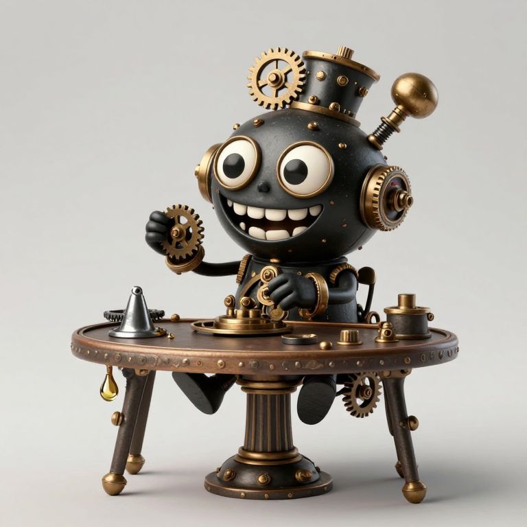 Steampunk-style, black, gear-adorned robot with wide eyes and a toothy grin, sitting at a brass table with gears and a