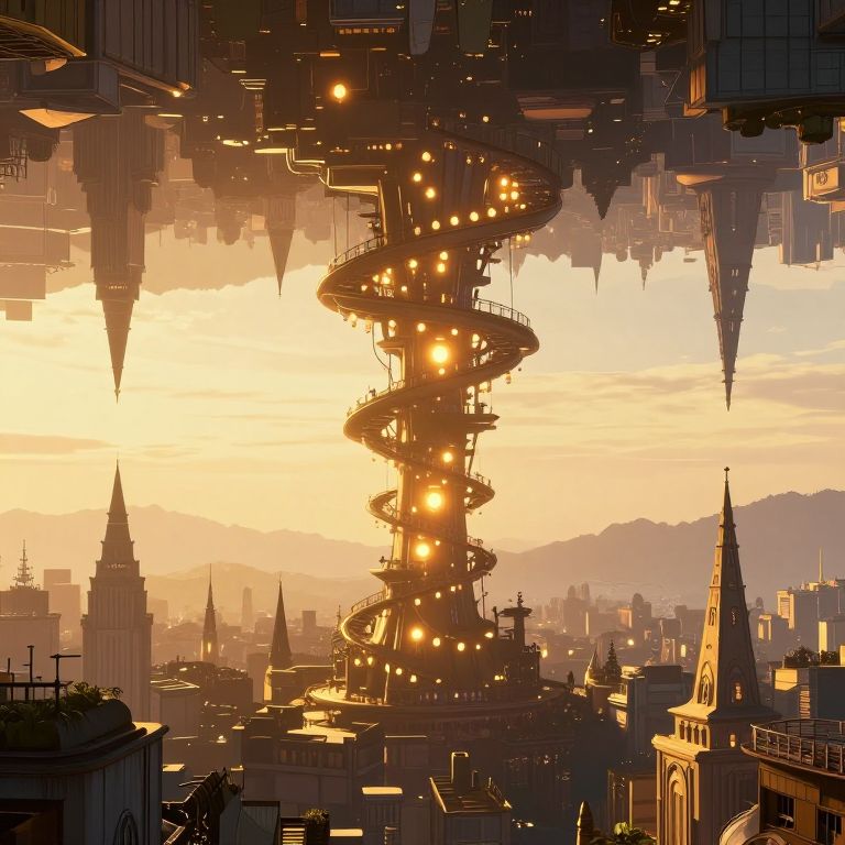 An inverted cityscape rendered in a surreal, cyberpunk-inspired digital art style features a towering spiral structure adorned with glowing lanterns, creating a mesmerizing golden-hour effect as it hovers above traditional buildings with pointed spires, evoking a fantastical world where gravity defies convention and light intertwines with architecture.