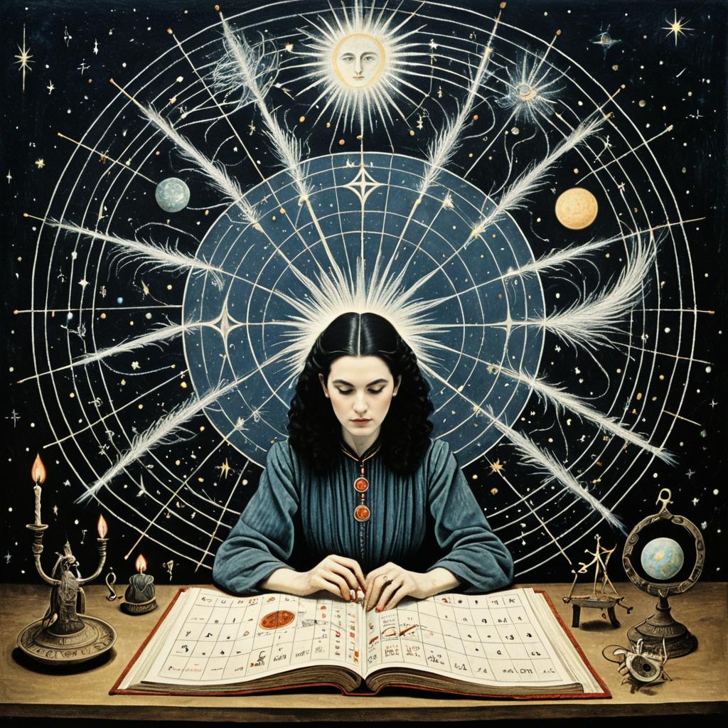 Surrealist artwork depicting a luminous female magician in a dark teal dress, seated at a table with an open esoteric calendar book. She is surrounded by mystical symbols, celestial bodies, candles, and magical instruments, with intricate cosmic threads radiating from her head against a starry backdrop. The scene combines elements of ritual, astrology, and time manipulation in a style inspired by Leonora Carrington.