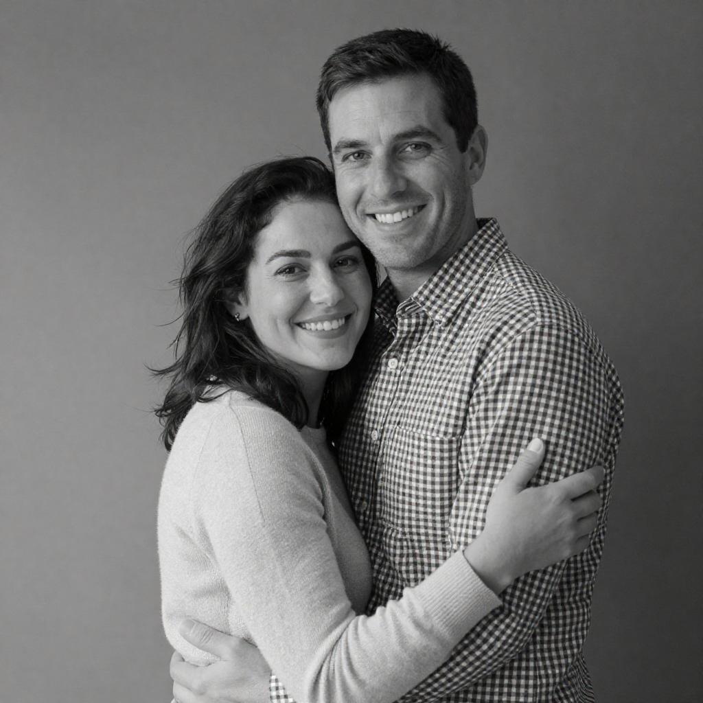 Black-and-white photograph of a smiling couple embracing. The man, with short dark hair and wearing a checkered shirt, stands behind the woman, who has dark hair and wears a light-colored sweater. They are in front of a patterned, ured wall. The woman's arms are around the man's waist, and he has his arms around her shoulders.