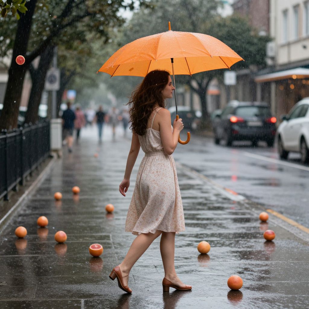 A woman walks gracefully through a rainy city street, her back turned as she holds a vibrant orange umbrella above her head, while grapefruit-sized hailstones scatter across the wet pavement, creating a surreal and whimsical scene.