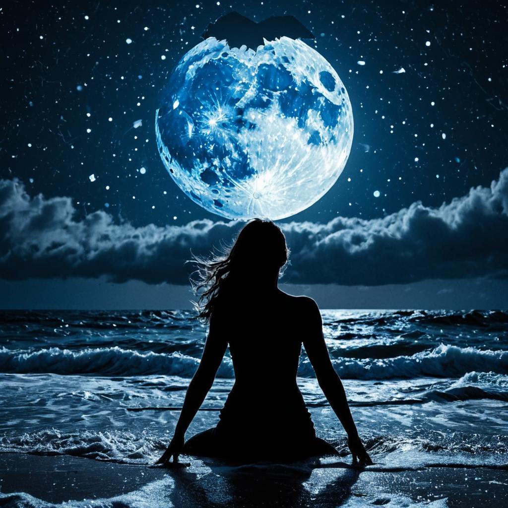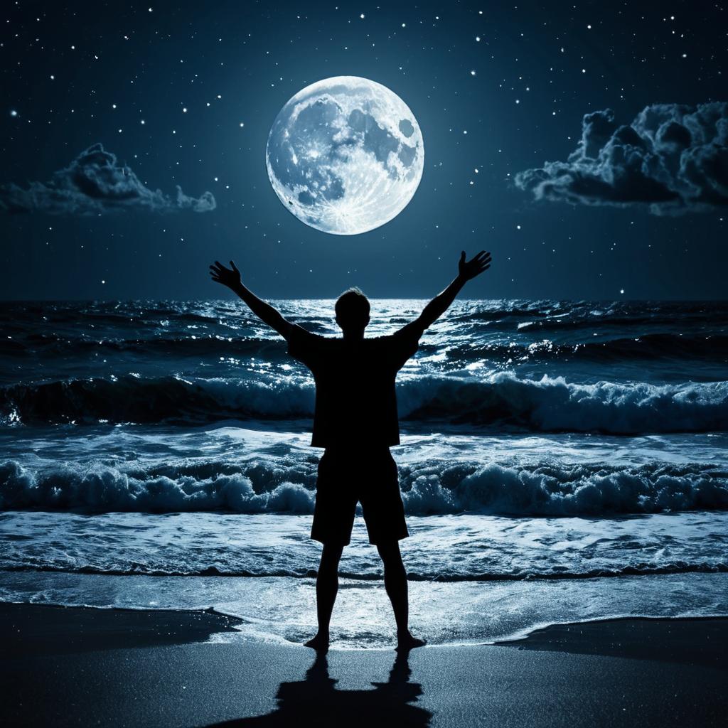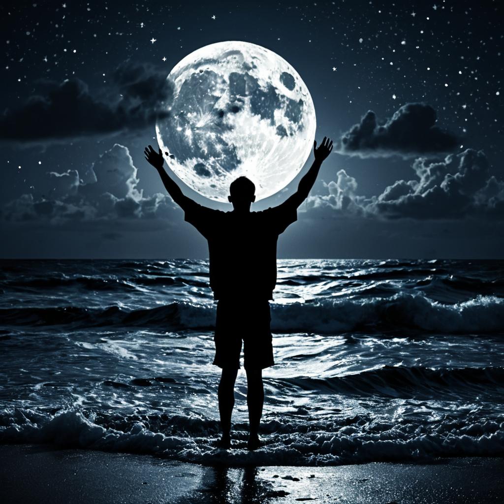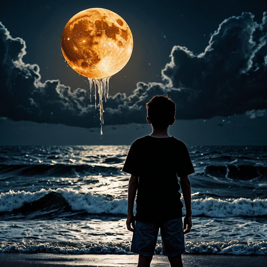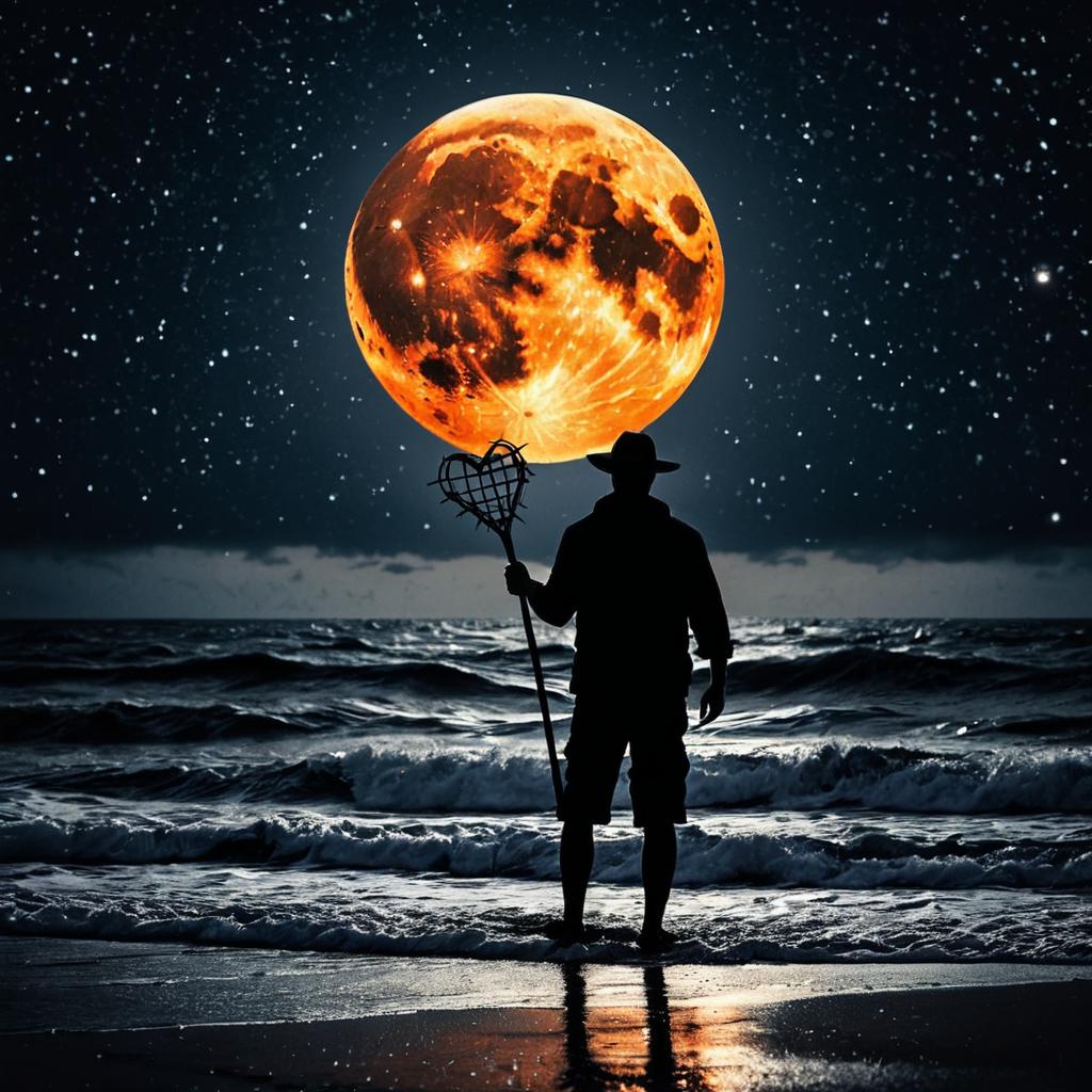Silhouette of Man with Cracked Orange Moon Over Stormy Ocean