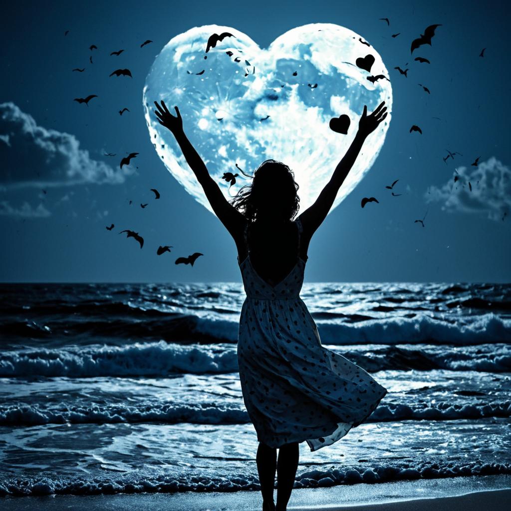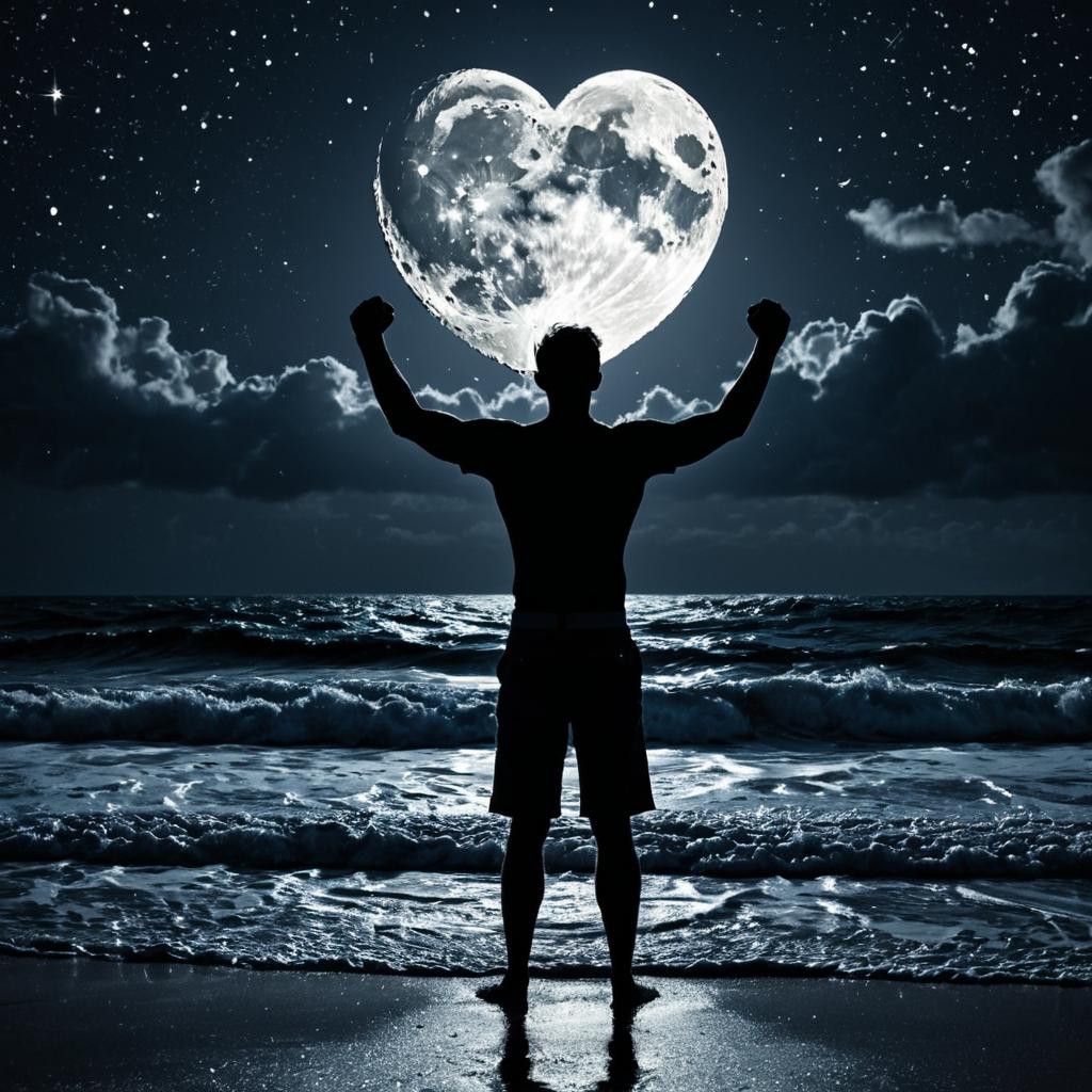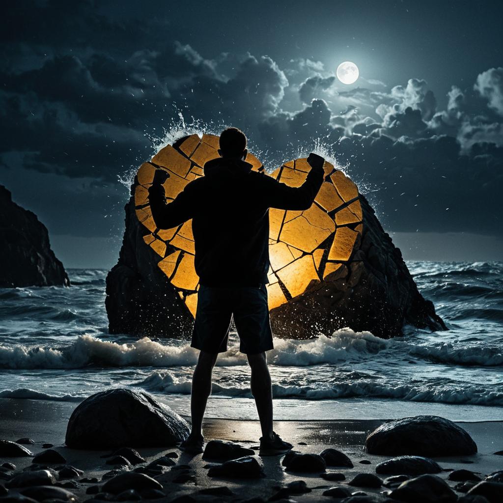 Full round moon broken, fissured with moderately cracked pieces missing, a few large pieces broken off splashing into the stormy ocean, bright orange-red moon high in the sky in the shape of a heart, starlit sky, photorealistic, highly detailed, close-up tall moonlight backlit silhouette of a man standing with crossed arms, standing on a beach seascape with stormy waves crashing and splashing