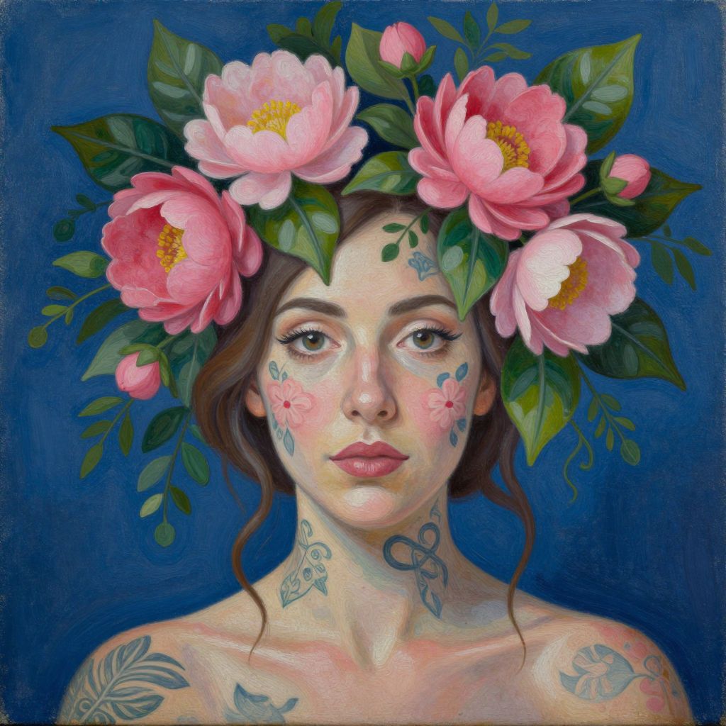 Digital painting of a tattooed woman with pink flower crown, blue background, green leaves, and soft pink petals, staring forward.