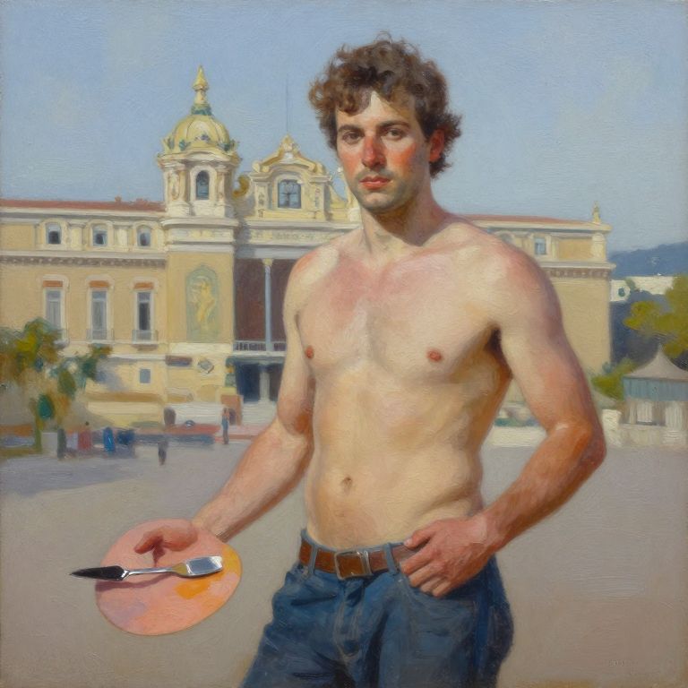Shirtless, muscular man with curly brown hair, holding paintbrush on circular palette, stands in front of a baroque-style building. Digital painting