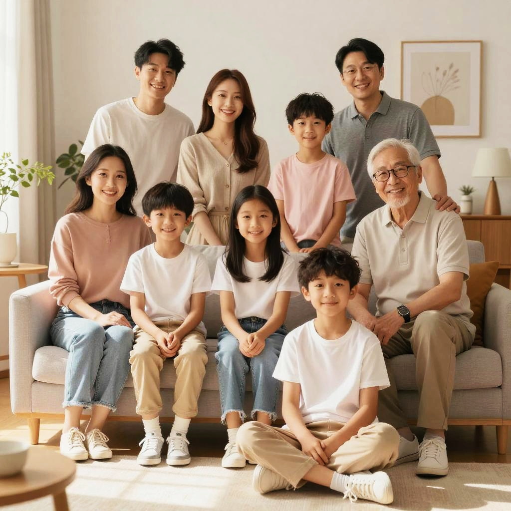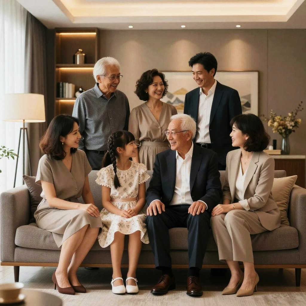 AI generated family photos with families in stylish modern interiors, warm ambient lighting, elegant clothing, authentic emotions capturing moments of affection and togetherness, hyper-realistic rendering capturing reflections, textures, and subtle background details.
