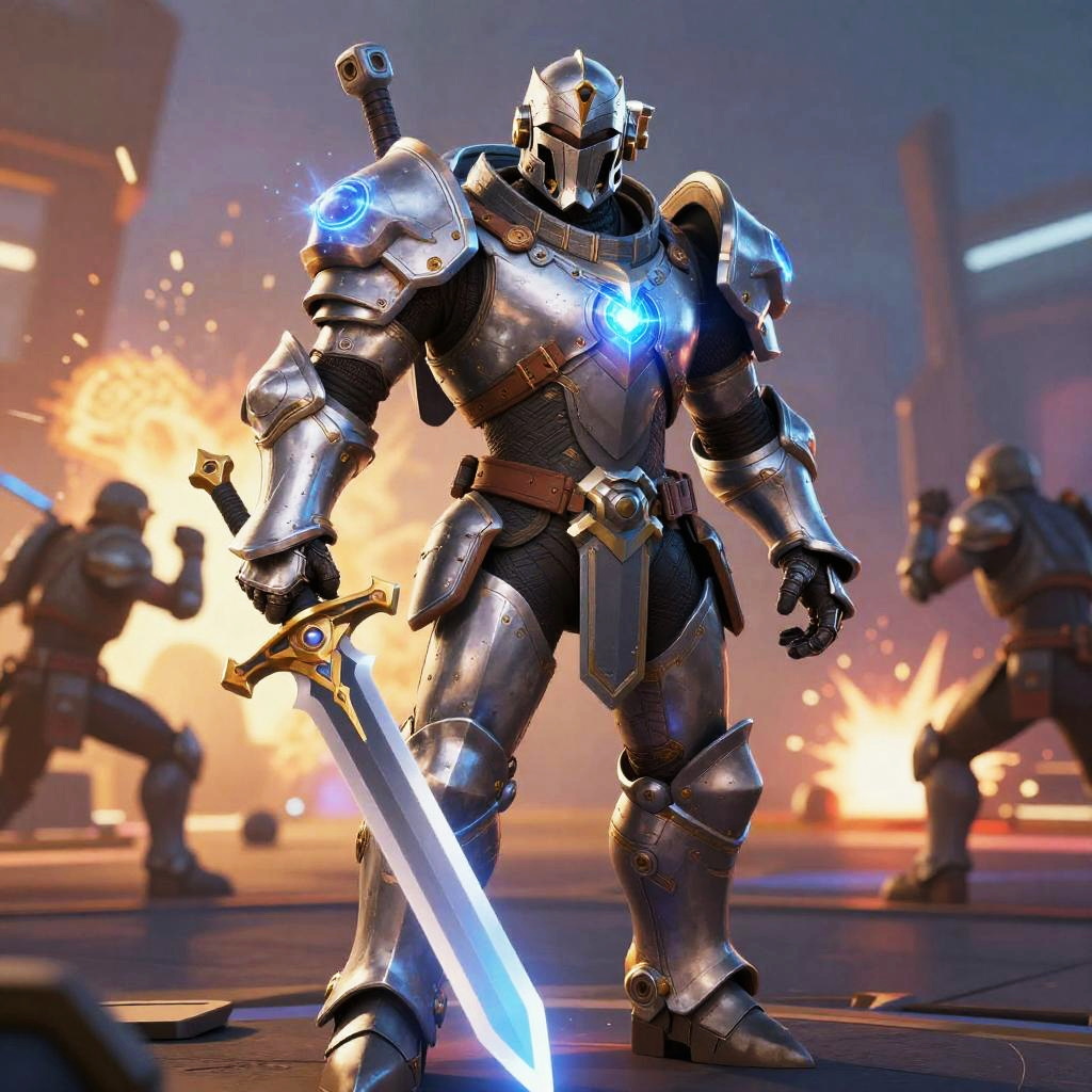 Unreal Fortnite skin illustrating a heroic knight reimagined with sci-fi elements, featuring plated armor with energy shields, a glowing sword, and a high-tech helmet, set in a vibrant battle scene with explosive effects.