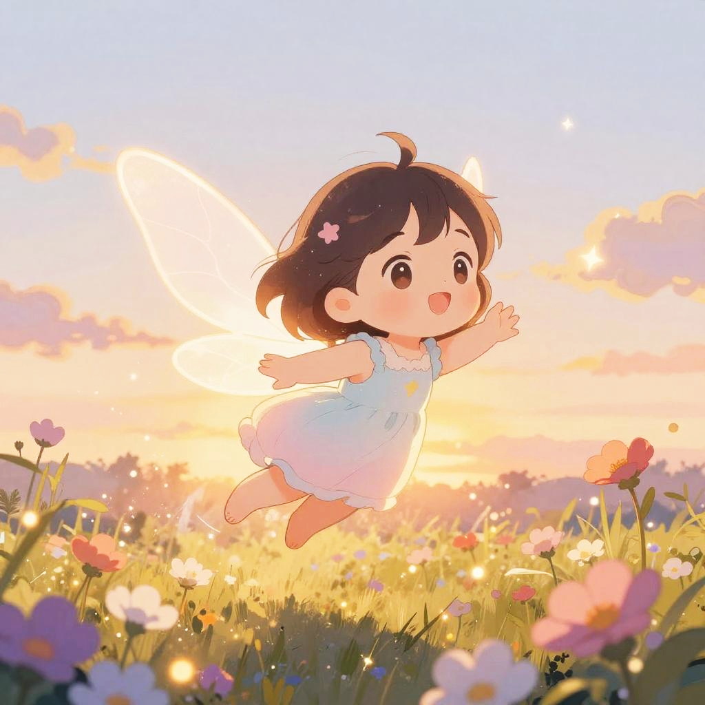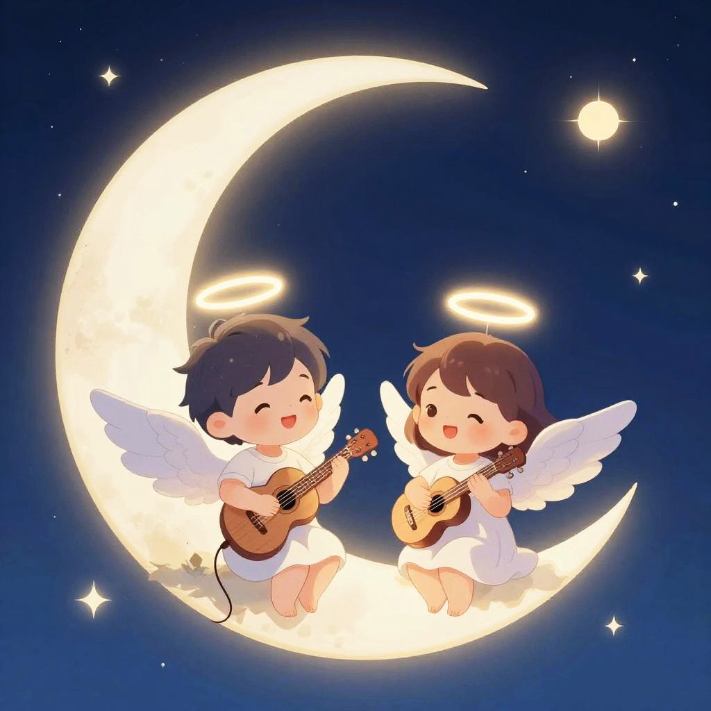 Digital anime-style illustration of four chubby, winged, haloed baby angels with different hair colors floating in a bright blue sky with stars.