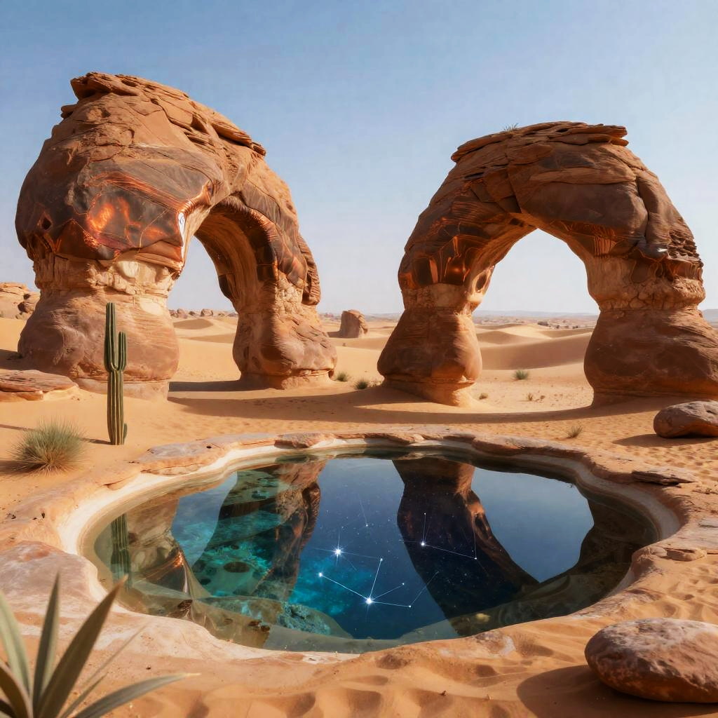 A surreal desert mirage with floating oases, featuring iridescent jewel tones with warm copper highlights and showcasing levitating sandstone arches and mirror-like oasis pools reflecting constellations that blend nature's beauty with an imaginative twist.