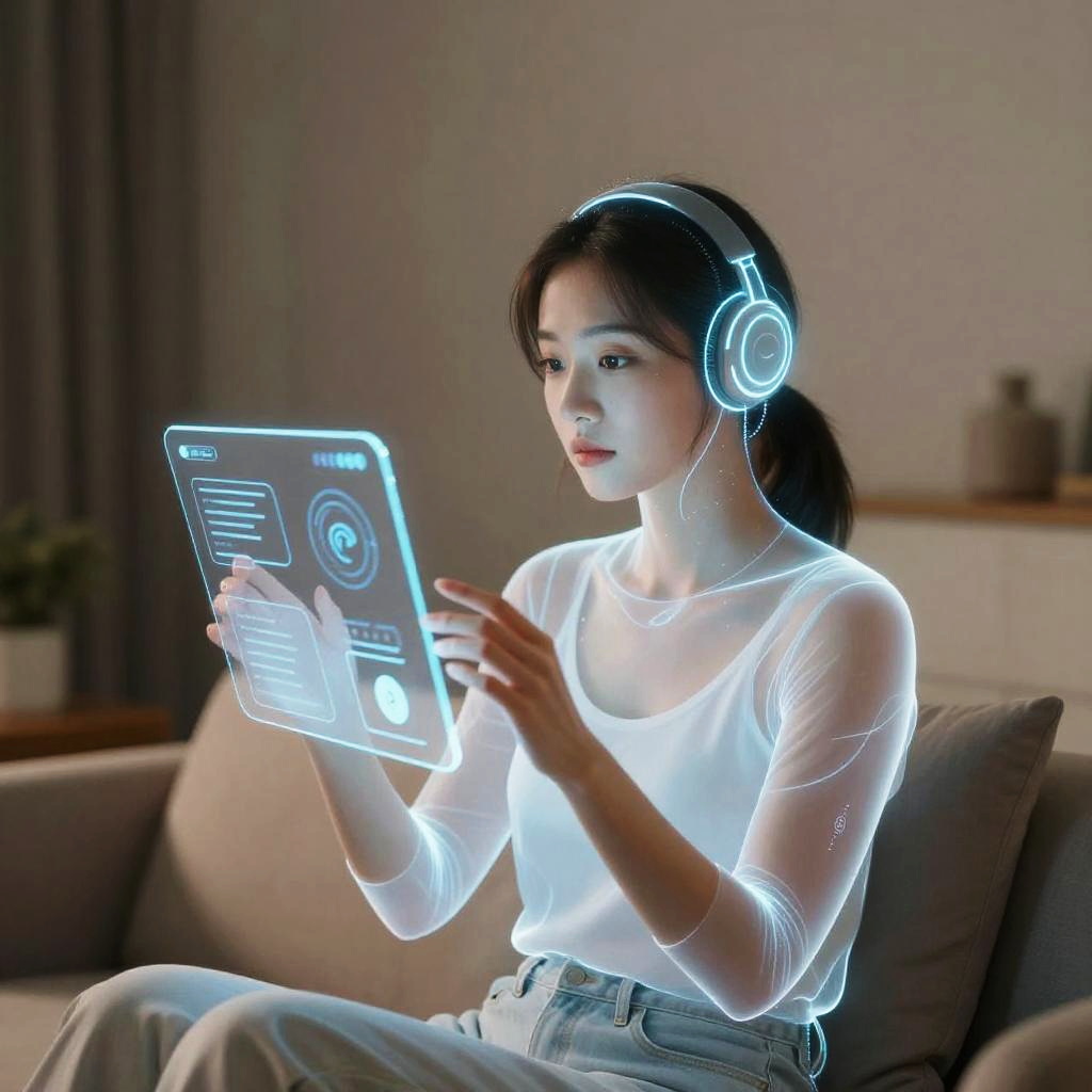 Photograph of a modern living room with three people; a glowing, holographic female robot with blue lights and headphones, smiling, interacting with seated individuals