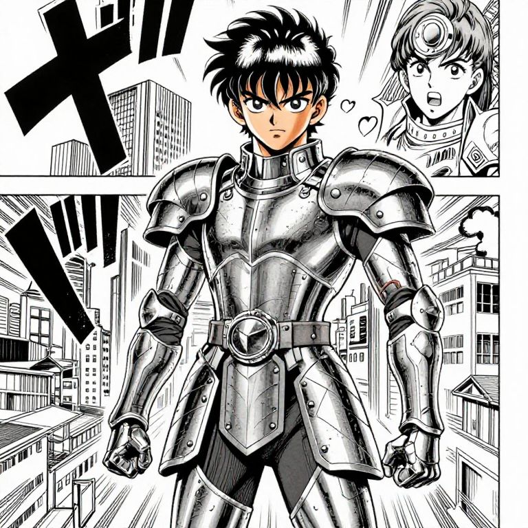 Custom manga style scene depicting a young hero with intricate armor standing in a vibrant cityscape, dynamic action lines, expressive emotions, detailed backgrounds, and bold inking typical of classic manga artwork.