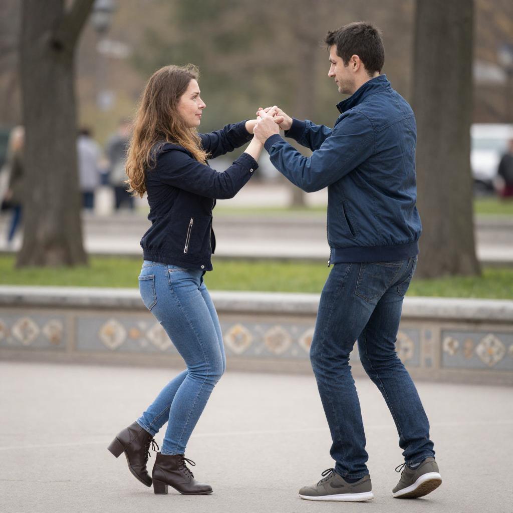 Black and white photograph of a couple dancing in an outdoor park. Woman with long, wavy hair, wearing a dark coat and flared pants, holds hands with a man in a jacket and jeans. They dance on a paved path with a decorative fence and trees in the background. Woman's face is not visible, man's face is not visible.