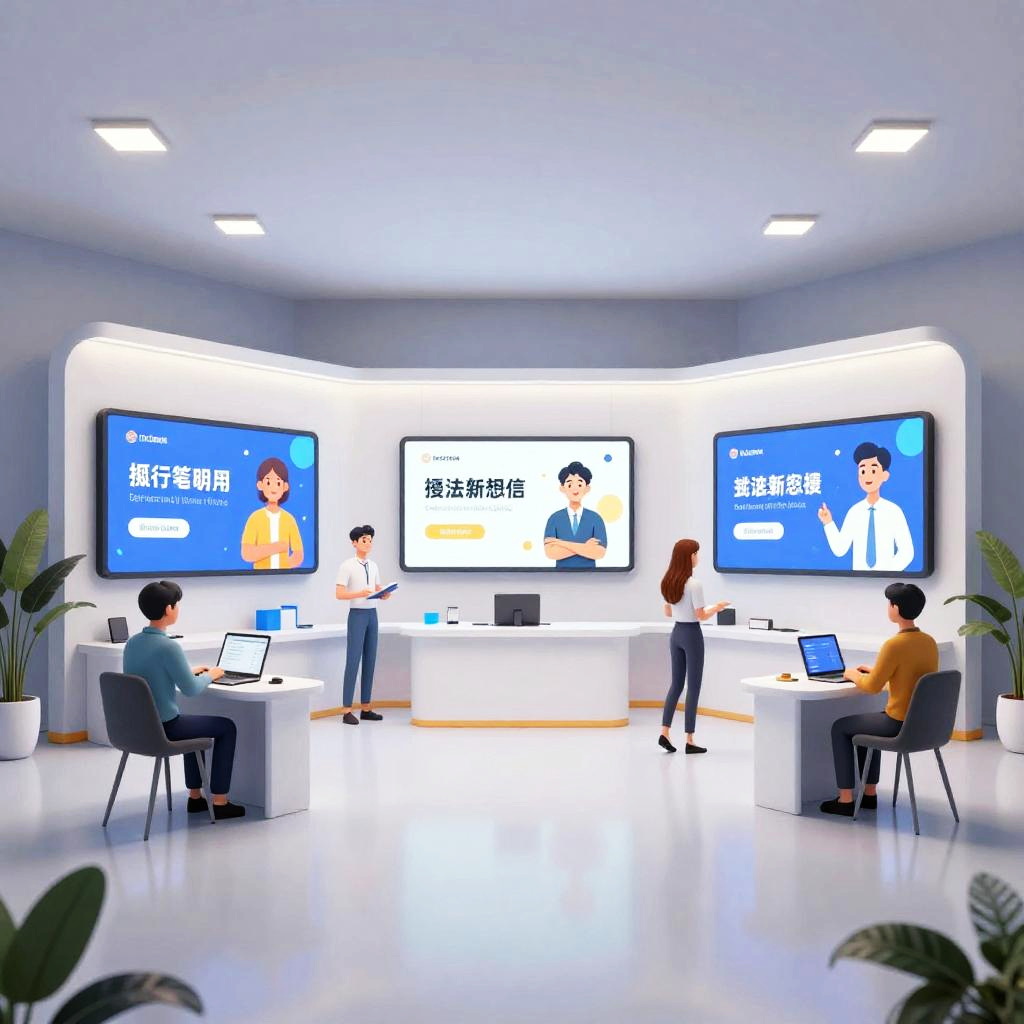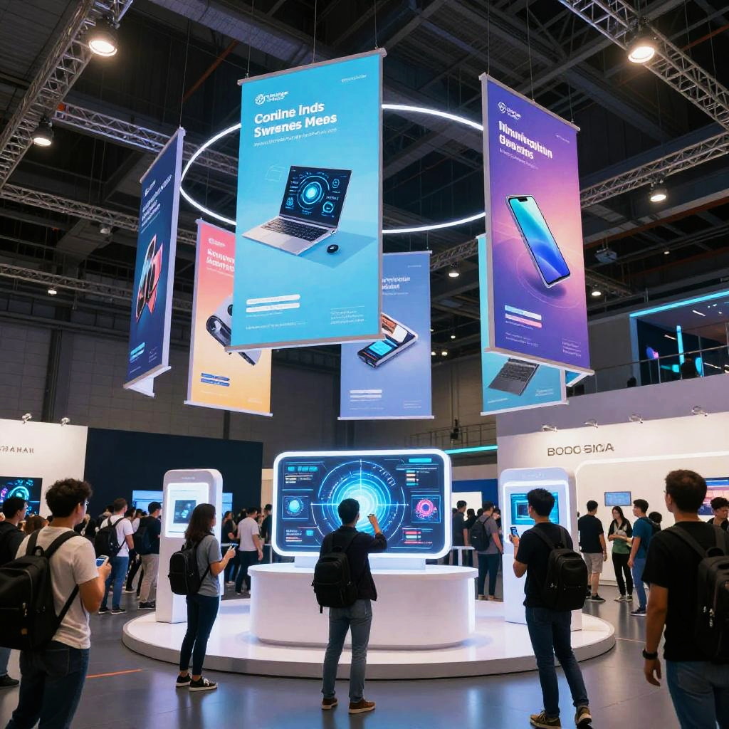 Futuristic online messestand scene filled with floating digital banners and touch-responsive panels, highlighting innovative technology products, set in a high-tech expo hall with dynamic lighting effects and a crowd of digital visitors engaging enthusiastically.