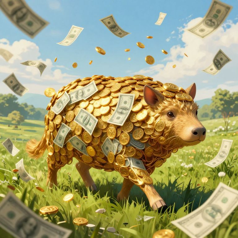A fantasy cashcow with a body of flowing gold coins and paper money, calmly walking through a lush meadow under a sky filled with floating bills, detailed and colorful, high contrast lighting, painterly digital illustration