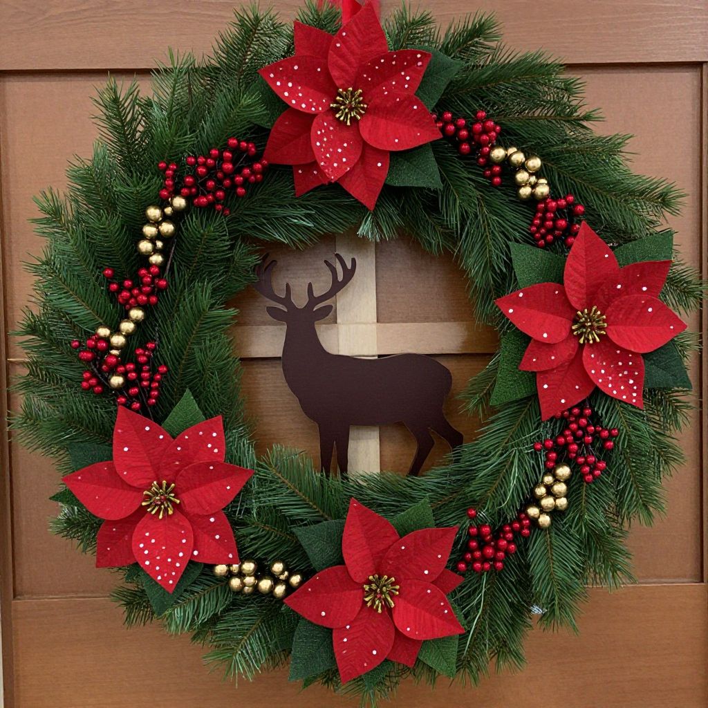 Christmas wreath with red poinsettias, white and red berries, and a black deer cutout, hanging on a wooden door.