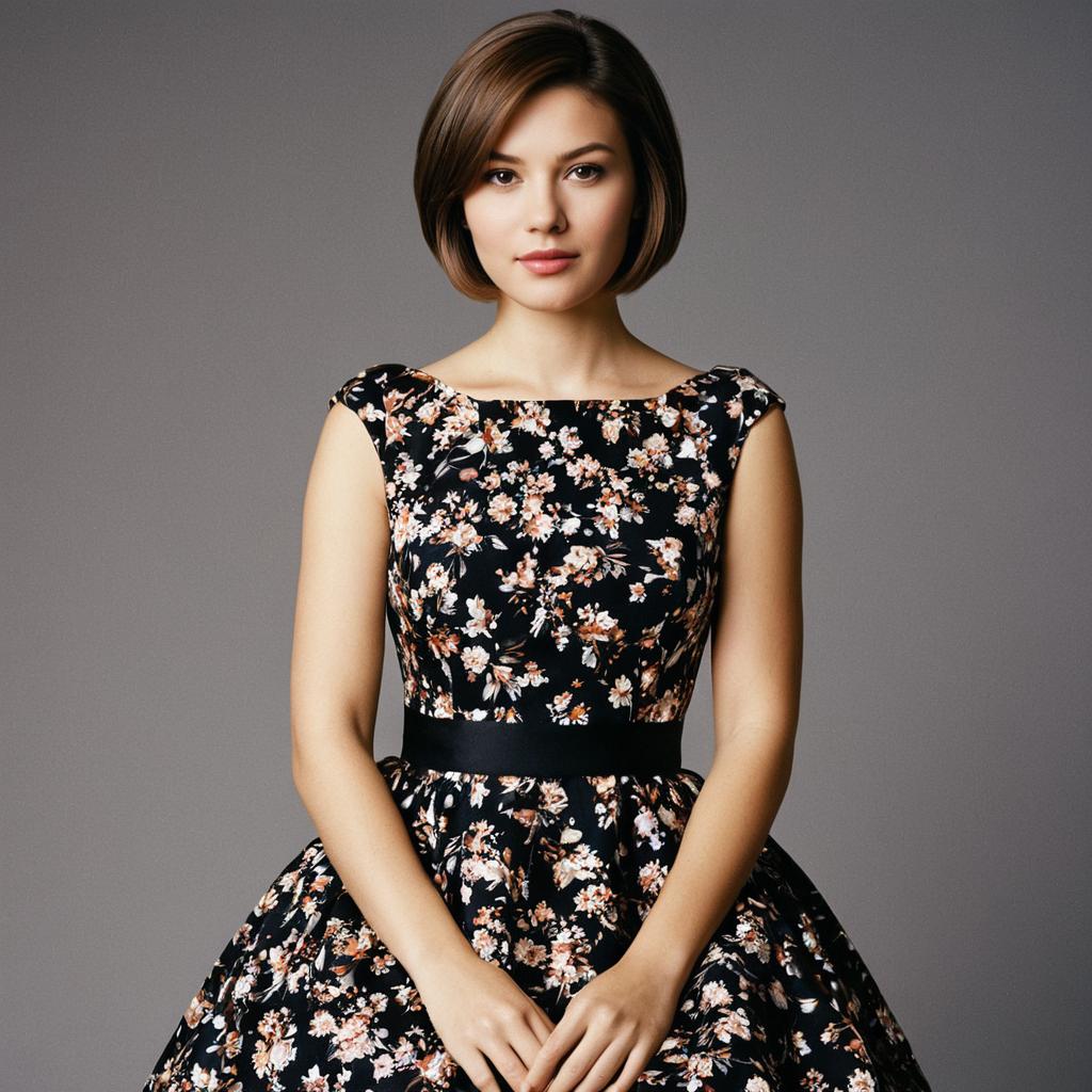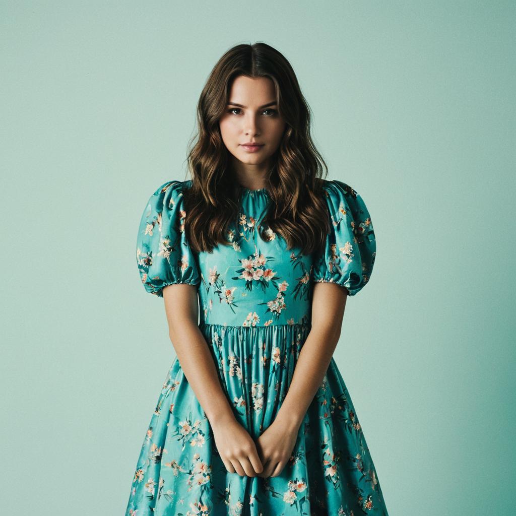 High tea outfit costume,1girl, solo, realistic, dress, brown hair, floral print, standing, lips, simple background, short sleeves, brown eyes