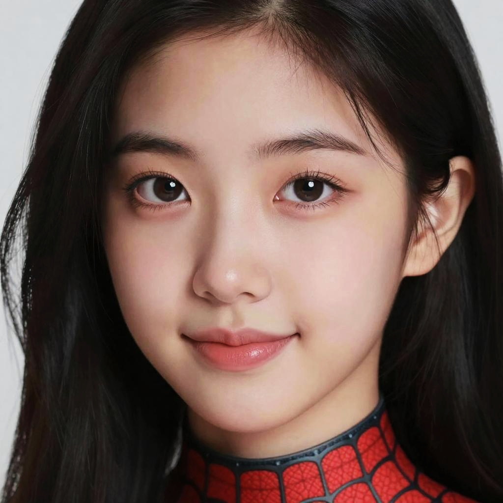 (ultra realistic), (illustration), (increase resolution), (8K), (extremely detailed), (best illustration), (beautiful detailed eyes), (best quality), (ultra-detailed), (masterpiece), (wallpaper), (detailed face), solo, 1 girl, looking at viewers, black hair, delicate details, pureerosfaceace_v1, (spider Man suit), smile, goYounJung
