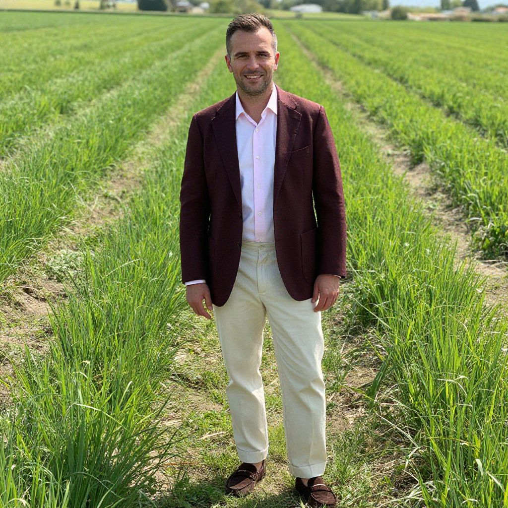 Photograph of a bearded man standing in a lush, green farmland. He has short, dark hair and is wearing a dark burgundy blazer, white dress shirt with the top buttons undone, and cream-colored pants. He also wears brown leather shoes. The man is centered in the image, standing on a narrow, grassy path between rows of green crops. The background shows a clear, sunny sky and distant trees. The overall scene is bright and vibrant, with rich greenery and a sense of rural tranquility. The man smiles slightly, looking directly at the camera.