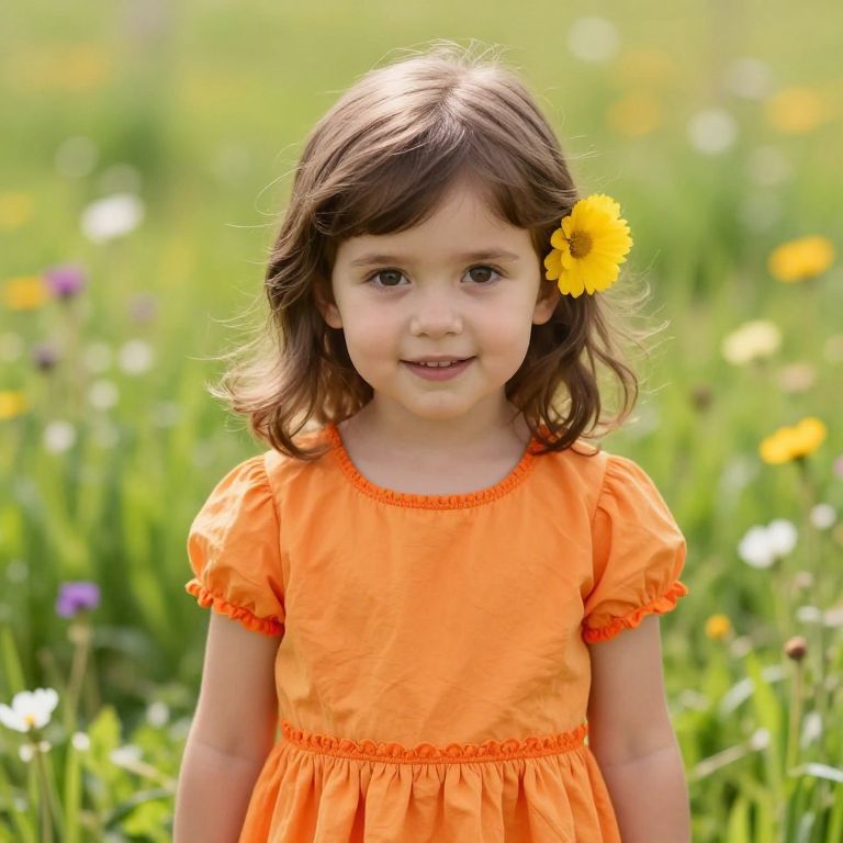 A beautiful girl with soft brown hair, a single yellow flower gently nestled in her hair, her eyes shining with warmth and curiosity. She is wearing a vibrant orange dress with delicate orange accents along the sleeves and hem, giving her a cheerful and lively appearance. The scene is set in a sunny meadow with soft grass and blooming wildflowers in the background, adding to the cheerful and natural atmosphere.