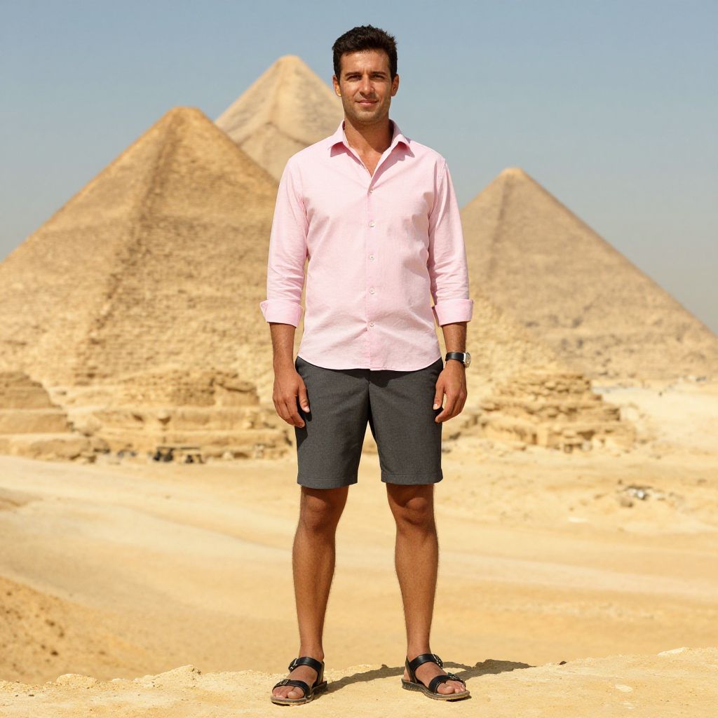 A man, pastel pink cotton Oxford shirt, charcoal tailored shorts, black leather sandals, standing by majestic pyramids, vintage photo style, relaxed smile, warm sunlight. Man has masculine face and piercing eyes