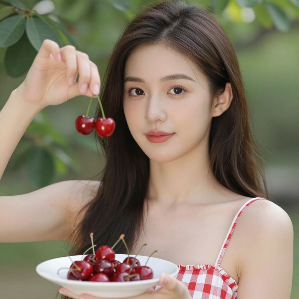 Photograph of an Asian woman with long, straight black hair and fair skin, wearing a red and white checkered sleeveless top. She is outdoors, with a blurred green leafy background. She holds a white bowl filled with red cherries in her right hand and lifts a cherry with her left hand towards her mouth. Her expression is calm and slightly smiling. The lighting is natural, highlighting her smooth skin and delicate features. The cherries are glossy and fresh, contrasting with the white bowl. The overall composition is bright and summery.