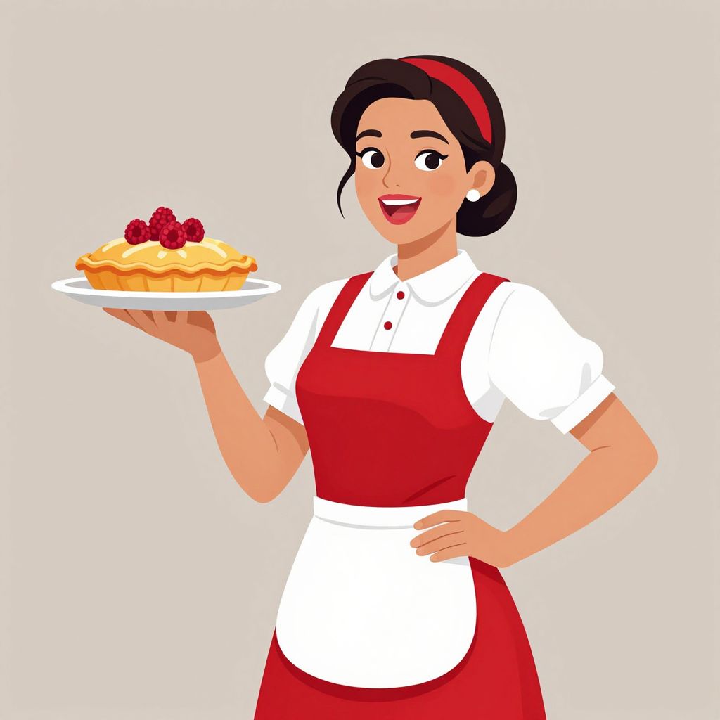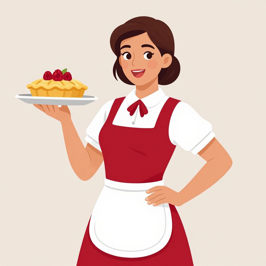 Cheerful waitress illustration showcasing a smiling woman in a traditional red dress and apron, elegantly holding a tray with a golden pie topped with fresh raspberries, set against a neutral background.